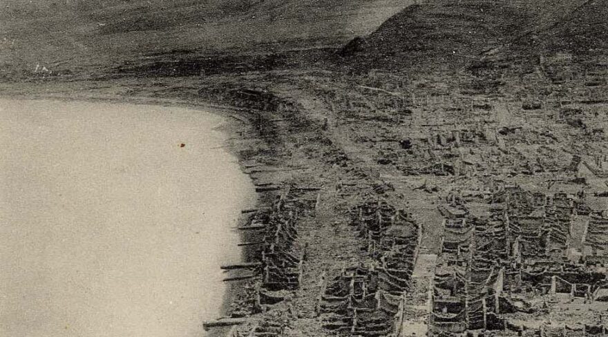 Upon hearing the news of the loss of 150 lives at the Usine Guérin, on the 7th of May, the Danish cruiser Valkyrien was ordered at sea to offer assistance to the French population in the vicinity of the Montagne Pelée. Captain HOLM was in command and was joined by the consular agent of France, Mons. J. HALLER, to facilitate coordination with the French authorities. The Valkyrien left St. Thomas on the 9th of May with 46,000 lbs of foodstuffs and a supply of medicine and surgical dressing for the surviving victims; she was the first foreign ship to arrive at the St. Pierre roadstead at 11 pm on the 10th of May. The city of 26,000 souls was lying in ruins engulfed in smoke and flames. Visibility was so poor that rescue operations could not be started until 9 o’clock the following morning. Only